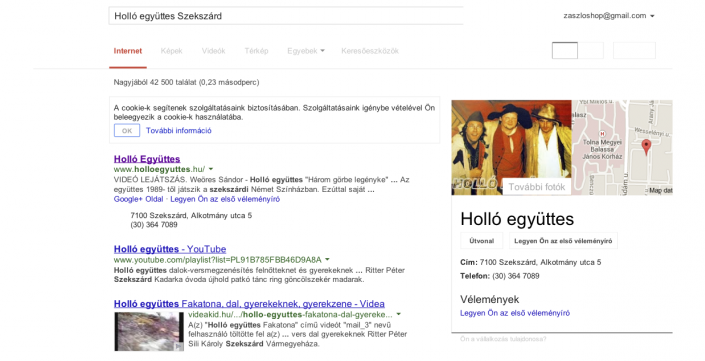 - Az alábbi példa mutatja, hogy a "Holló együttes Szekszárd" keresőszavakra a kép jobbszélső részén megjelent egy fénykép, pontos címet mutató térképpel, útvonal optimalizációs lehetőséggel, a keresett név címével, telefonszámával, sőt még vé-leményt is írhat. A Google jelen szolgáltatása ingyenes, létrehozásában "fillérekért" segítünk.